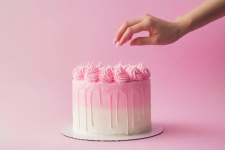 A gently poised hand reaches for the top of a stunning ombre cake, showcasing the playful elegance of modern dessert artistry in a minimalist setting.