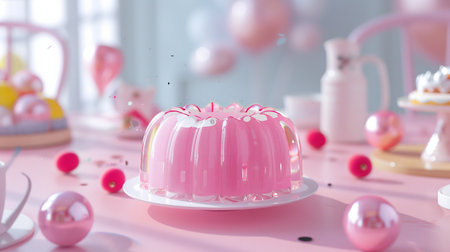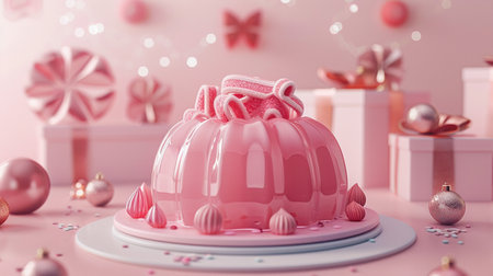 A sweet and whimsical pink jelly dessert adorned with a festive bow and surrounded by sparkling ornaments, perfect for celebrations.