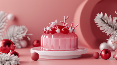 A delightful pink cake adorned with festive red and white baubles and frosted twig decorations, perfect for holiday and celebration themes.