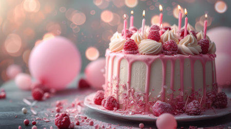 A visually appealing pink cake with glossy frosting, fresh raspberries, and celebratory balloons, perfect for any festive occasion.