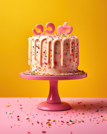 A birthday cake with sprinkles on a pink cake stand. Generative AI image.
