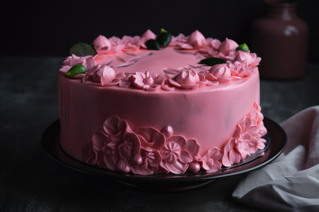 a pink frosted cake with flowers on a black plate with a white napkin and a bottle of wine in the backgrouf. . generative ai