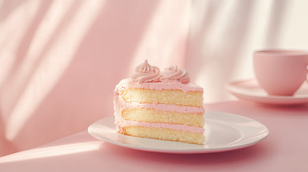 A visually appealing slice of pink frosted cake on a white plate, basking in gentle natural light. Perfect for dessert and food photography.