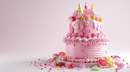 This image shows a two-tier pink birthday cake decorated with colorful sprinkles and candies. The cake is sitting on a white surface, and there are more sprinkles and candies scattered around it. The background is a soft pink.