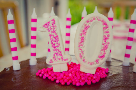 Cake decoration in the figure of the number 10, made of sugar dough and candy in white and pink.