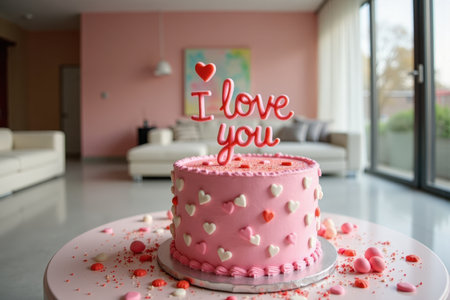 A beautiful cake with I love you written on top in icing. The background features colorful decorations and hearts for a festive Valentine's Day celebration. Modern Interior Style.
