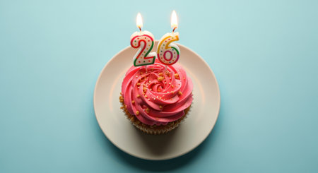 Pink frosted cupcake with number 26 birthday candles on white plate against pastel blue background celebrating special occasion.