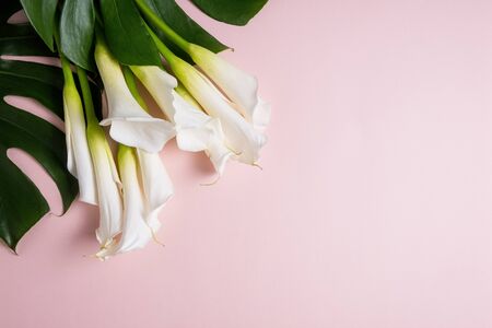 Bouquet of White calla lilies and monstera leafs on pink background with copy space, top view