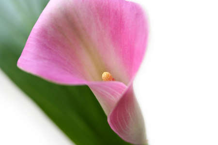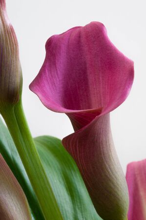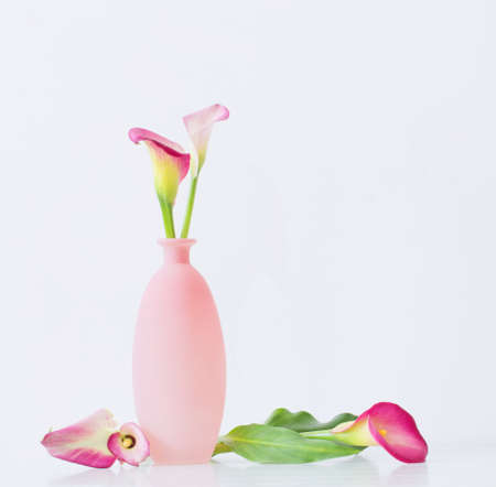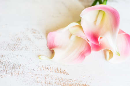 Gentle white pink calla flower with smock around, on ;ight background, vertical composition