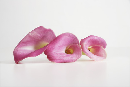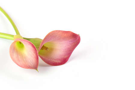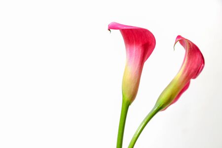 Two pink Calla lilies on white background for Valentines day card or Valentines gift, birthday, dating, anniversary. Pink calla flowers texture close-up with copy space. Floral macro photography
