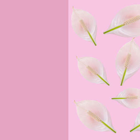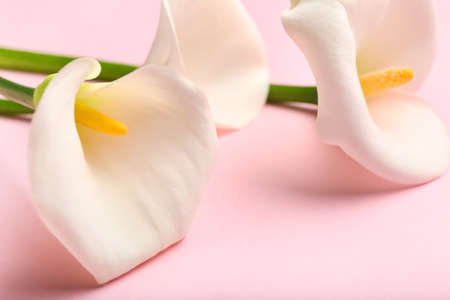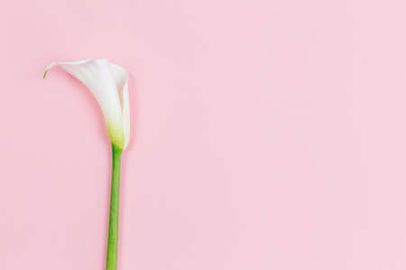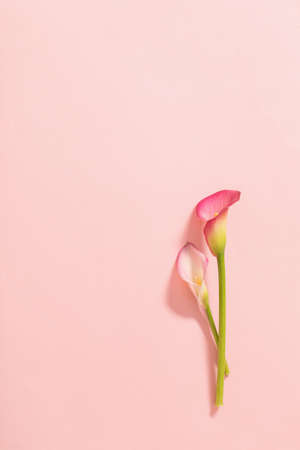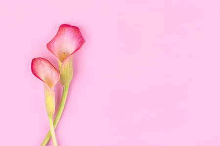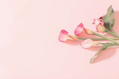 Beautiful white Calla Lilies flowers on a pink pastel background. Flat lay. Place for text.