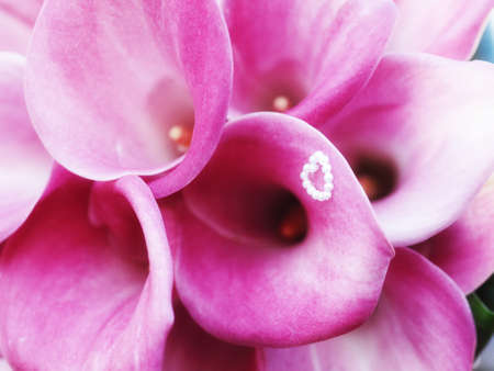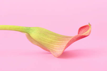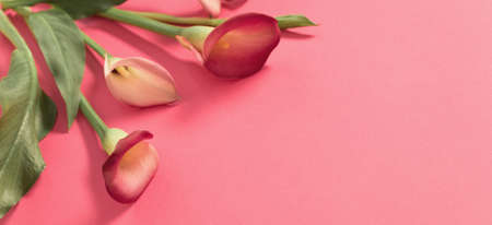 Pink Calla lilies on pink background for Valentines day card or Valentines gift, birthday, dating, anniversary. Pink calla flowers texture close-up with copy space. Floral macro photography