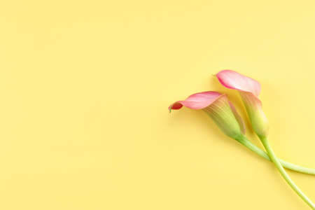 Two pink Calla lilies on yellow background for Valentines day card or Valentines gift, birthday, dating, anniversary. Pink calla flowers texture close-up with copy space. Floral macro photography