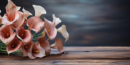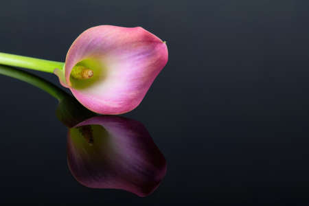 Pink Calla lilies on black background with reflection for Valentines day card or Valentines gift, birthday, dating, anniversary. Pink calla flowers texture close-up with copy space