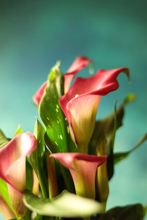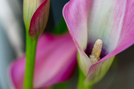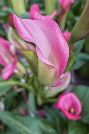 Pink calla lily flowers. Zantedeschia aethiopica or arum lily, Araceae. Blooming natural botanical plant garden.