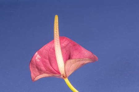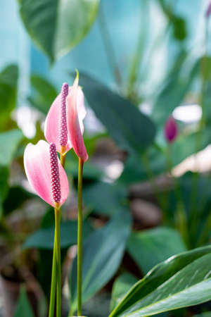 red heart shaped flower, close-up on anthurium flower plant, exotic flamingo flower.Original pink anthurium flower blooming in the garden. Common names include anthurium, tailflower