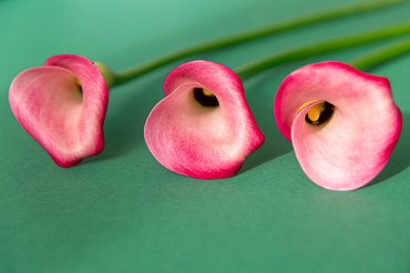 Three pink calla flowers lay on a green background. Look inside a flower.
