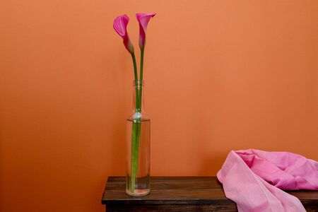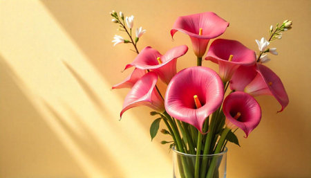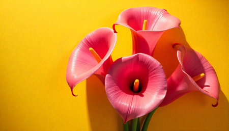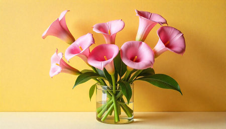 Pink calla lilies bouquet in glass vase on yellow backdrop