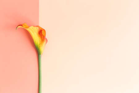 Beautiful yellow Calla Lily flower on a peach pastel background. Flat lay. Place for text.