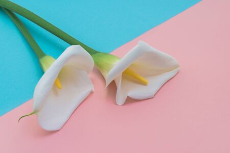 Two white calla lilly flowers on pink and blue background. Top view. Close up.