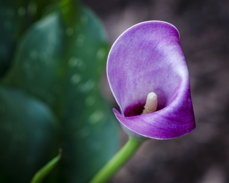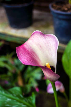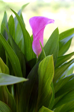 Pink Calla Lily flower on green foliage background close-up, selective focus