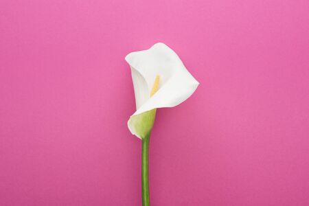 Beautiful magenta calla lily on pastel purple background. Flat lay. Place for text.