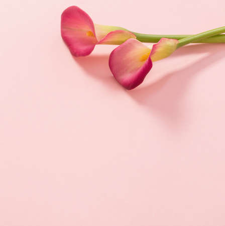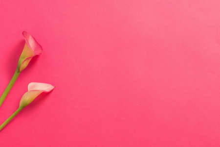 Two pink Calla lilies on pink background for Valentines day card or Valentines gift, birthday, dating, anniversary. Pink calla flowers texture close-up with copy space. Floral macro photography