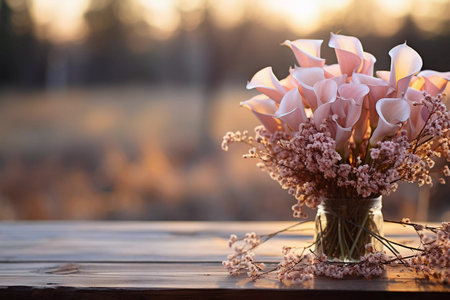 A beautiful flower bouquet on a wooden table with blurred background. Greetings card for valentines day, mothers day, birthday or wedding with copy space