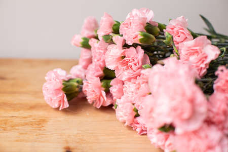 Bouquet of pink carnations on a white wooden table.