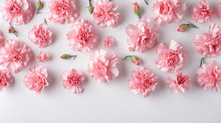 Pink carnations scattered across a white background. Generated by artificial intelligence.