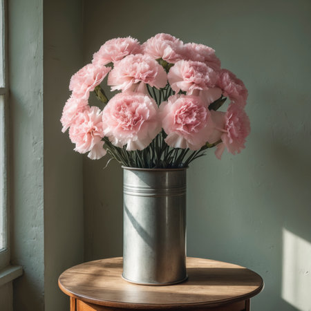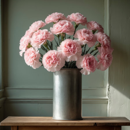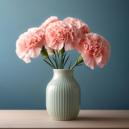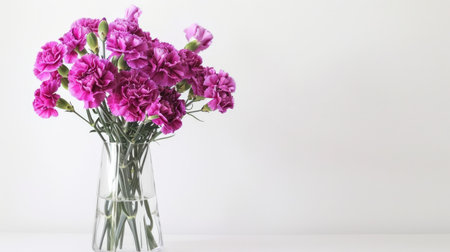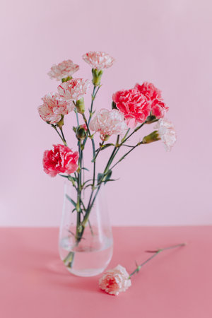 Fresh Carnation flowers in a simple vase on a table with a minimalist background