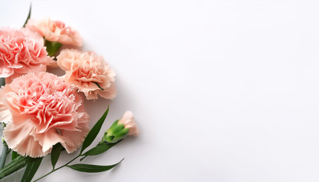Carnation Flower with leaves pattern on side position provides copy space for text. background concept isolated white