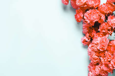 Creative layout made of colorful carnation flower on pastel background. Copy space. Flat lay. Nature concept