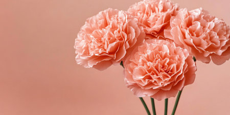 A close up of a bouquet of peach colored carnations against a peach colored background space left
