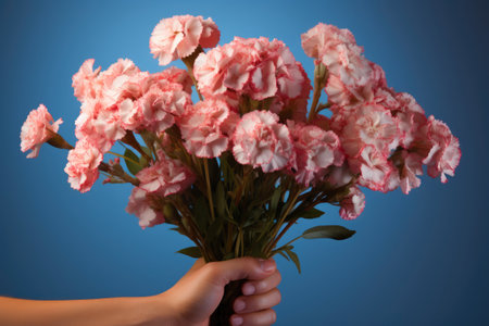 A close-up image of a hand holding a bouquet of pink carnations against a beige background. The image is soft and elegant, capturing the beauty of the flowers.