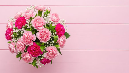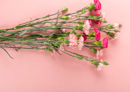 Design concept of Mother's day holiday greeting design with carnation bouquet on pastel pink table background