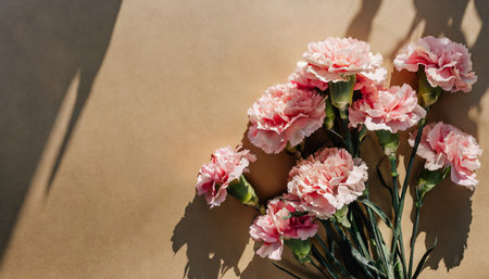 pink carnation flowers bouquet on tan background with deep sunlight shadows flat lay top view floral composition
