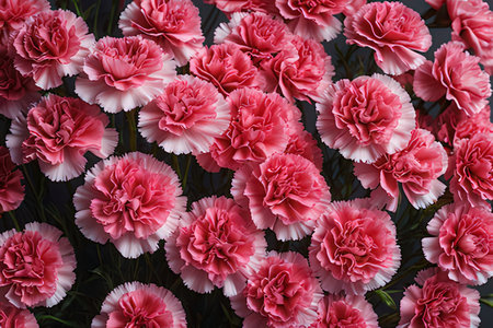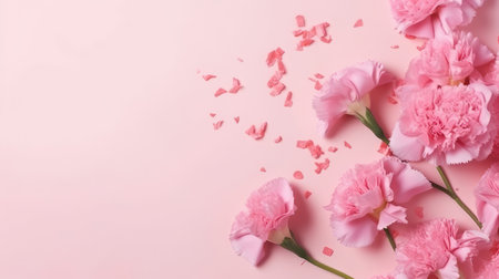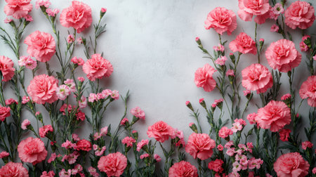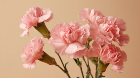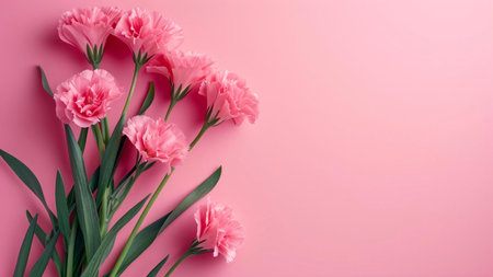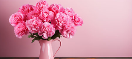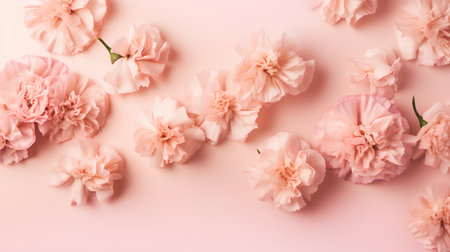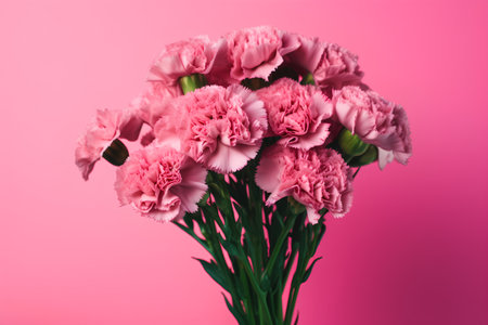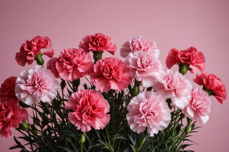 Delicate pink carnations create a harmonious composition against a matching pink backdrop, celebrating beauty and grace