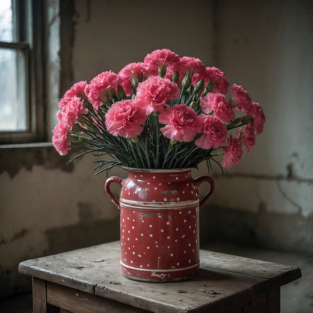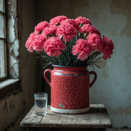 An arrangement of carnations in a vase on a wooden table against a weathered background. The scene appears simple and nostalgic, with soft light falling through the window.