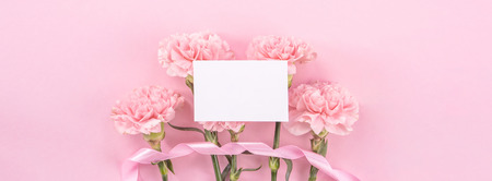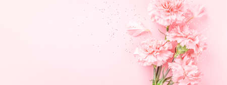 Pink carnations on pink background. Banner with flowers in pastel colours.