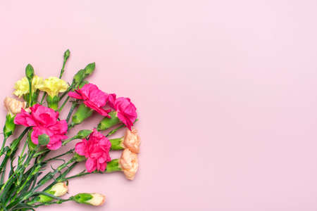 Fresh carnation flower bouquet on pink background top view with copy space. Yellow, pink and red flowers of dianthus or schabaud mockup