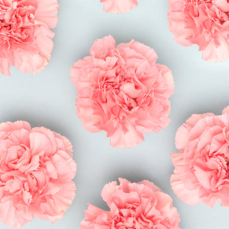Pink carnation flowers on a blue pastel background.
