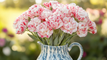 A fresh bouquet of pink and white carnations arranged in a ceramic pitcher.