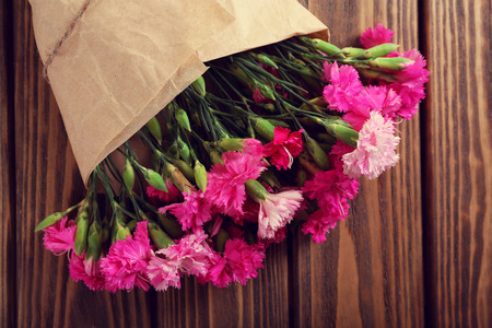 Beautiful bouquet of pink carnation on wooden table close up