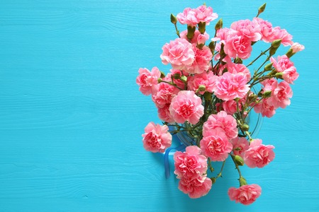 Bouquet of Carnation flowers on blue wooden background. top view