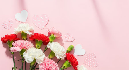 Bouquet of red white and pink carnations with paper hearts on pastel pink background for romantic celebration and spring greetings.