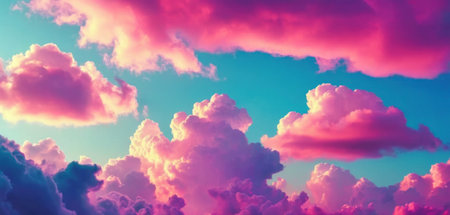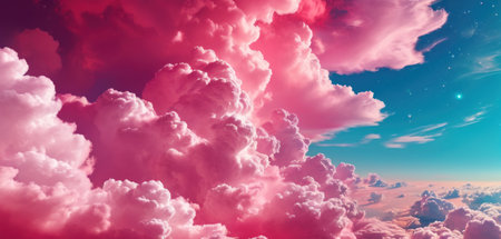 Beautiful view of pink clouds in vibrant sunset sky. Clouds are fluffy and full of light, creating stunning visual display. Dramatic unreal sky with cumulus and stratus clouds in atmosphere. AI art.