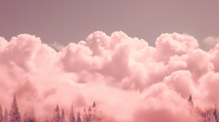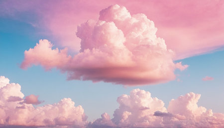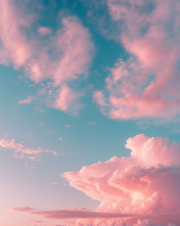 A breathtaking fantasy image featuring soft, fluffy pink clouds in the sky, resembling cotton candy. This whimsical backdrop captures tranquil dreamlike serenity, perfect for imaginative and