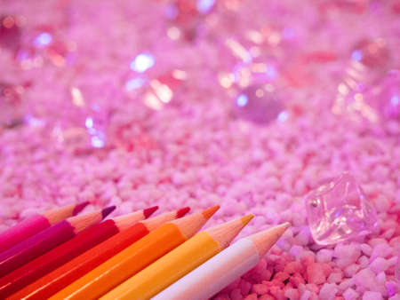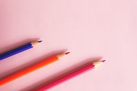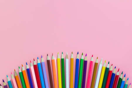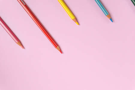Color pencils on a light pink background. Top view with space for text. Back to school concept. Flat lay stationery mockup. Bright backplate for your design. Spectrum of different colors