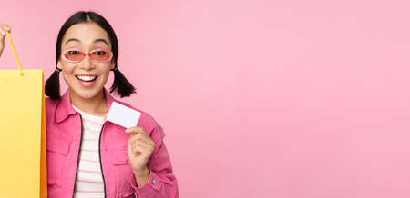 Happy young asian woman showing credit card for shopping, holding bag, buying on sale, going to the shop, store, standing over pink background
